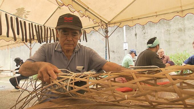 別の場所では、平たい竹を編んでいます。作っているのは…旗頭です。過去の大綱曳きで使用された実物を見ながら、手探りで作業をしています。