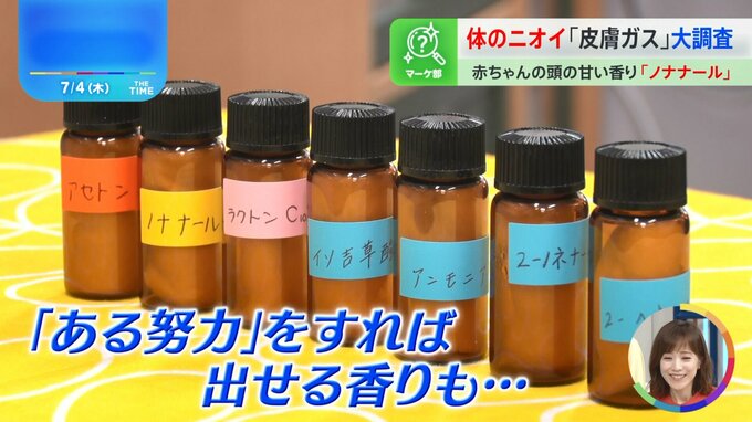 また、“ある努力”をすれば出すことができる皮膚ガスが、「アセトン」。ネイルの除光液のような、リンゴのような香りで、運動などで体の脂肪分が燃焼すると出てくるといいます。