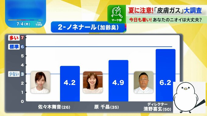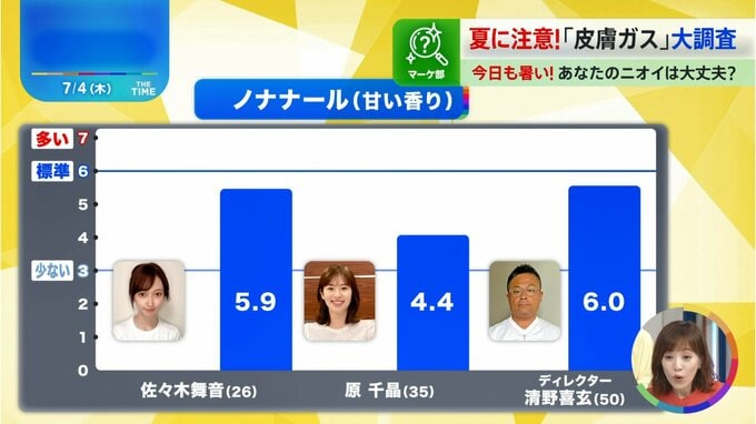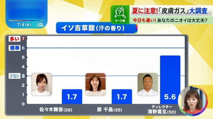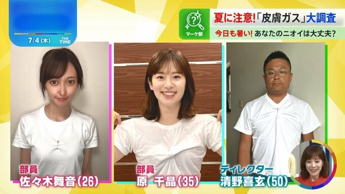 そこで!佐々木舞音アナウンサー(26)と原千昌部員(35)、男性ディレクター(50)の3人の体臭を調べてみました。
