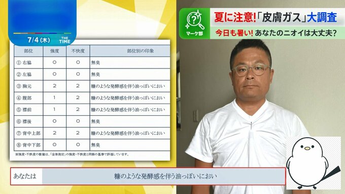 まず、【全体の印象】の評価として、佐々木アナと原部員は「無臭」。一方男性ディレクターは「糠のような発酵感を伴う油っぽいにおい」との結果が。