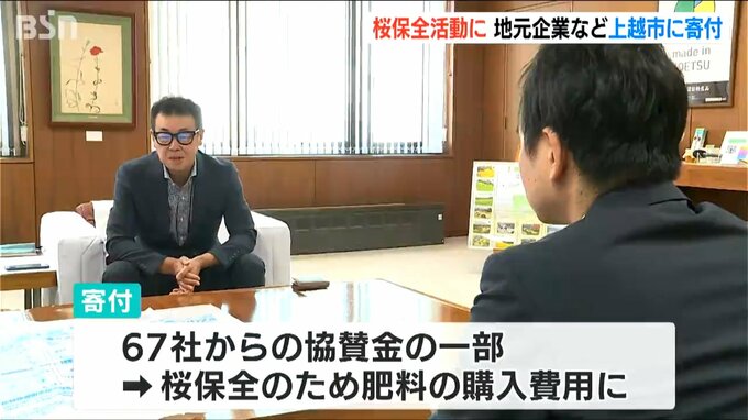市内の企業を中心とした67社から寄せられた協賛金の一部で、高田城址公園の桜を保全するための肥料購入費用などに充ててほしいとしています。