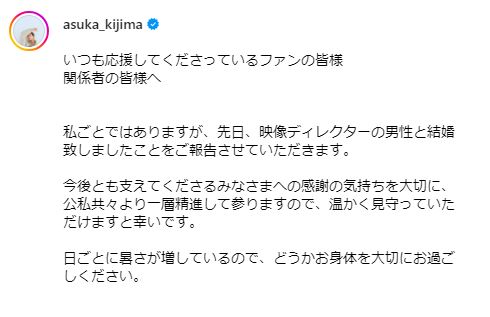 貴島さんは、純白のウェディングドレス姿の写真を投稿し、「私ごとではありますが、先日、映像ディレクターの男性と結婚致しましたことを ご報告させていただきます。」とコメント。