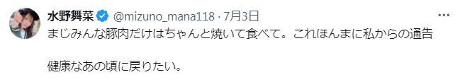 水野さんは2日に「体調悪いと人間てこんなに食欲無くなるんや、、」と投稿。続く3日の投稿では「まじみんな豚肉だけはちゃんと焼いて食べて。」とフォロワーに注意喚起。前日の投稿の体調悪化は "生焼けの豚肉を食べてしまったからなのか" と、フォロワーに推測させるような投稿となっています。
