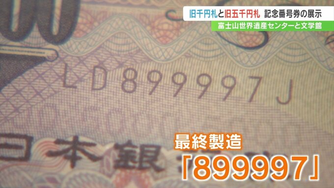 最終製造番号「900000」の直前「899997」と、20年前の発行開始時に日本銀行から贈られた「6」の番号の旧5000円札が並んでいます。