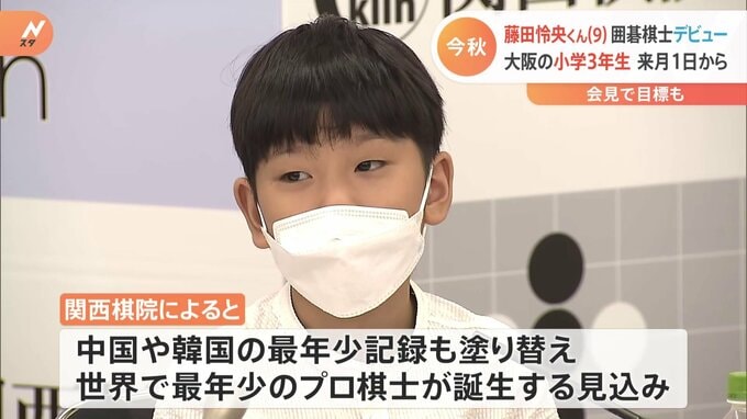 この秋にも、プロの囲碁棋士としてデビューするのは史上最年少の小学3年生です。ちょっと緊張した面もちの男の子、来月1日からプロの囲碁棋士としてデビューする大阪の小学3年生・藤田怜央くん(9)です。3年前、1…