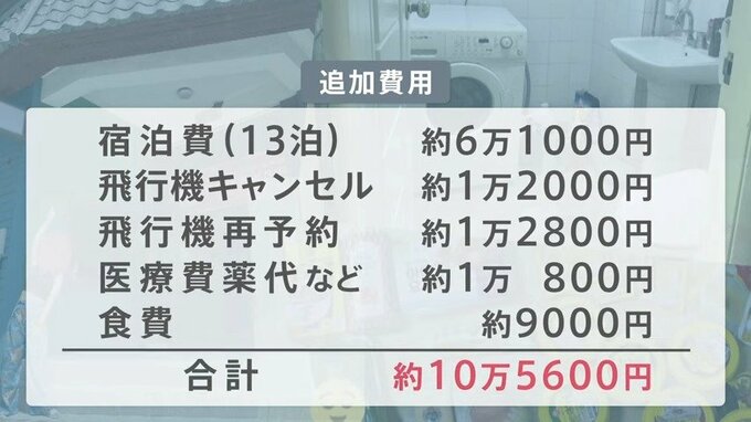 想定外の連泊分、それと飛行機のキャンセルやチケットの取り直しなどで、10万円以上の費用が余分にかかっているといいます。