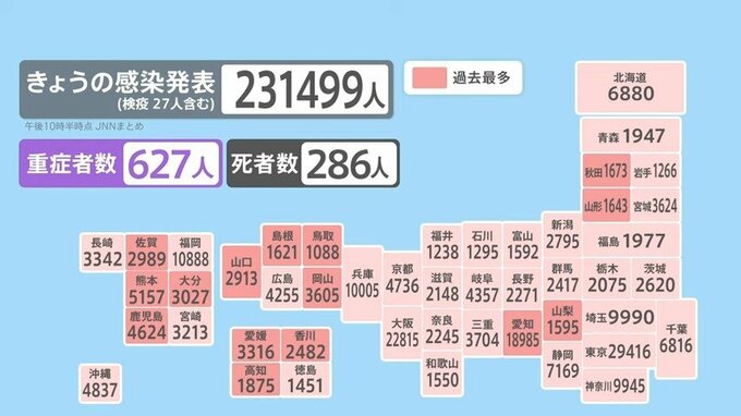 全国では、23万1499人と、6日ぶりに20万人を超えました。愛知や熊本、鹿児島など、15の県で過去最多を更新しています。