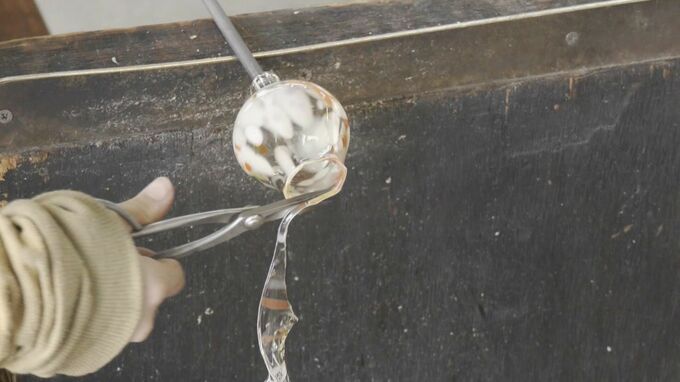 職人が、およそ1300度の炉で溶かしたガラスを手作業で形を整え、空き瓶1本が7個の風鈴に生まれ変わります。