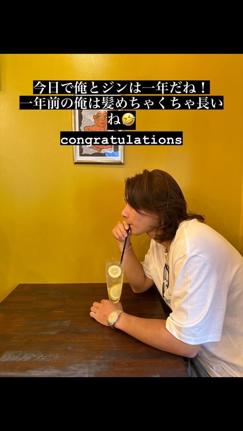 平野さんは、「今日で俺とジンは一年だね! 一年前の俺は髪めちゃくちゃ長いね」と、当時の姿を載せて振り返り、「congratulations」と、1周年を祝いました。