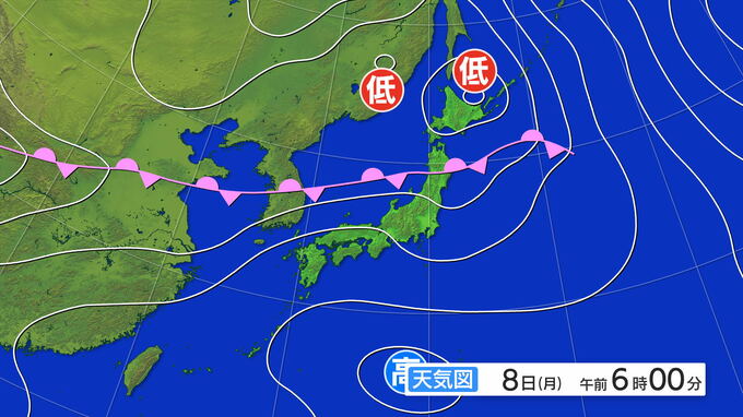 8日(月)から9日(火)にかけ、北陸や東北では梅雨前線の影響で大雨になるおそれがあります。土砂災害などへの警戒が必要です。