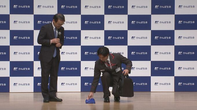 その「お客様のお宅に訪問した際のカバンの置き方」をステージ上で実演することになり、静かな会場内で淡々と作業した磯村さん。無事に終えると、“CM撮影より緊張しました。かんぽさんはシレッとやりますので” と、ホッとした表情を浮かべていました。