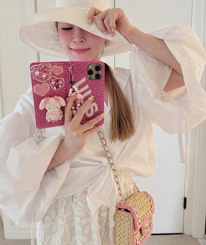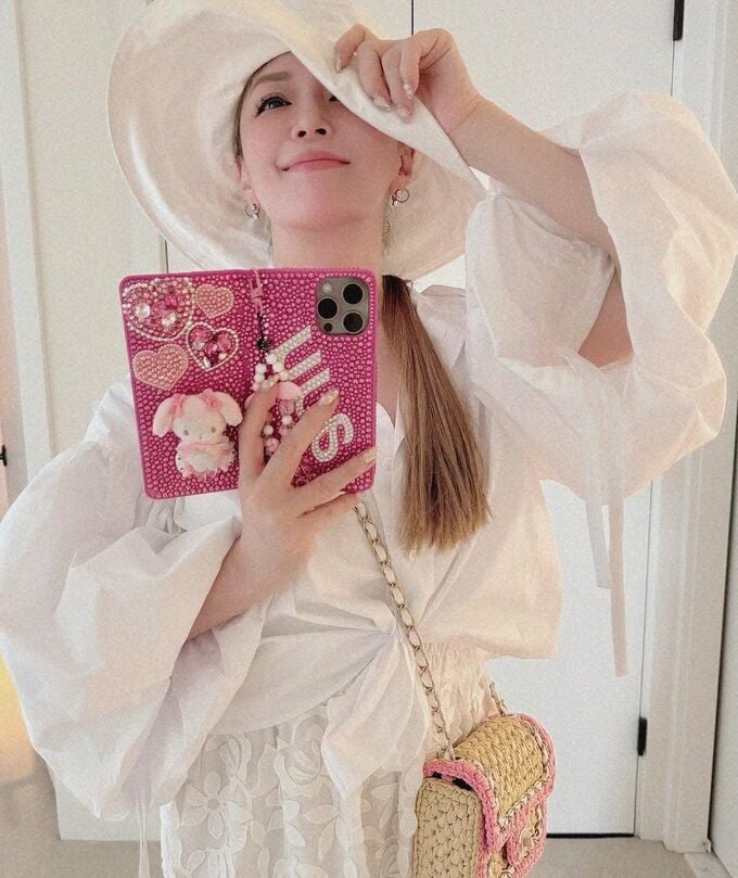 6月には、「毎日こんな気温だとピンク魂が触発されまくります」と綴り、ピンクのトップスにピンクのネイル、そしてピンクのタペストリー柄のモンスターバッグを顔の横に近づけている、全身ピンクのコーディネート写真を。浜崎さんは公開していました。
