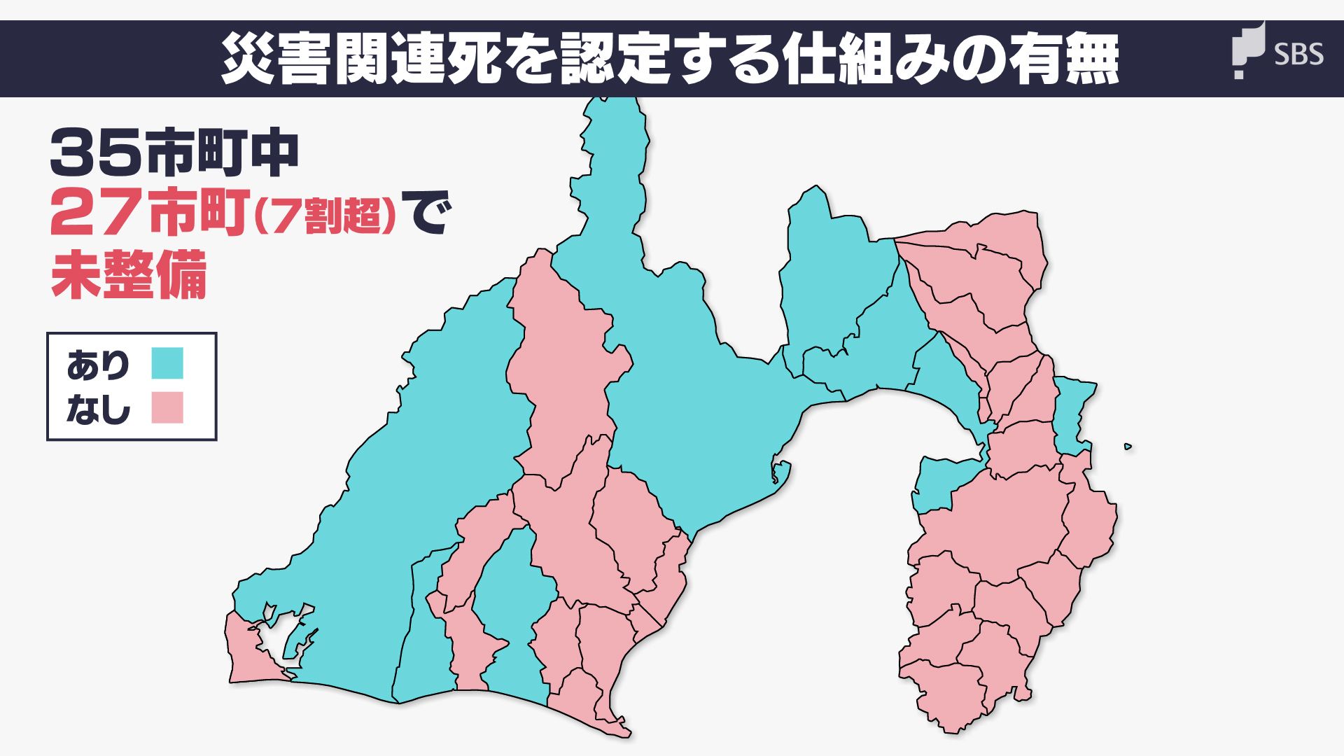 「SBSは、静岡県内全35市町にアンケートを実施しました。災害関連死を認定する審査会の設置を規定している自治体は8つ。残りの27市町、全体の7割以上にあたる自治体で災害関連死の認定の整備が完了していないことがわかりました。その理由は、専門的知識が必要、過去に住居がなくなるような自然災害がないなどといった意見がありました」