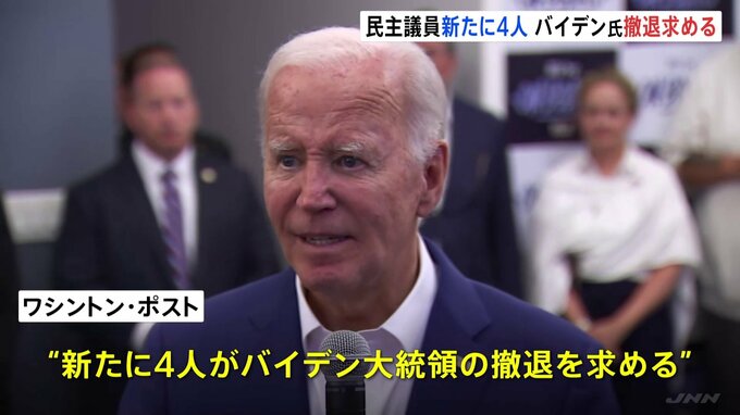 アメリカのバイデン大統領の大統領選からの撤退を求める声が広がっています。民主党・下院議員のオンライン会議で新たに4人の議員が撤退を求めたと報道されました。ワシントン・ポストによりますと、民主党の議会…