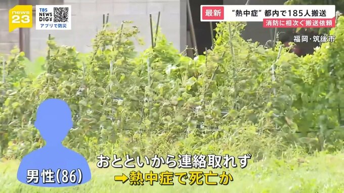 また、福岡県筑後市では、86歳の男性が畑で倒れているのが見つかり、その場で死亡が確認されました。男性は6日から連絡が取れず、農作業中に熱中症で死亡した可能性があるとみられています。