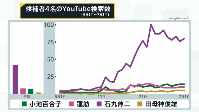 選挙期間中、YouTubeにおける石丸氏の検索回数はほかの候補を大きく上回りました。