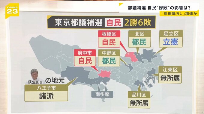 東京都議会の補欠選挙も同時に行われましたが、自民党は8つの選挙区で2勝6敗と大きく負けました。
