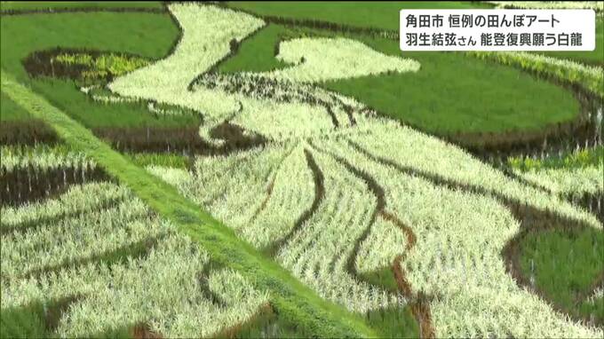 恒例の田んぼアートが宮城県角田市にお目見えしました。今年はプロスケーター、羽生結弦さんに加えて、能登半島地震からの復興を願う白龍、白い竜が描かれています。角田市の西根地区にある50アールの田んぼに描か…