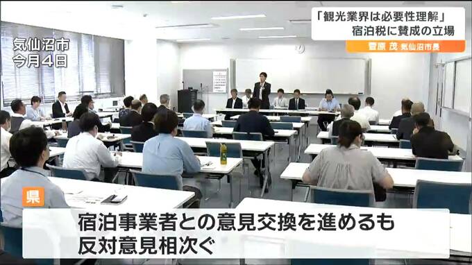 宿泊税について、県は1人1泊300円としたい考えで、導入された場合旅館やホテルなどの事業者が宿泊客から税を徴収し県に収めることになります。県は現在、宿泊事業者との意見交換を進めていますが、反発が強まっていて、先週、気仙沼市でも反対の声が相次いでいました。