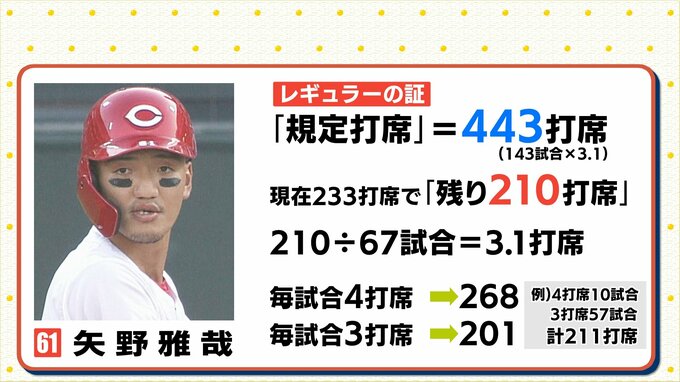 レギュラーの証といわれる「規定打席」443打席です。年間143試合×3.1という計算方法なんですが、矢野選手が到達するには残り210打席となっています。これから67試合で到達できるのかというところですが、1試合あたり、▽4打席ずつ立つと268打席で行けるんですが、▽3打席ずつだと201打席とちょっと足りなくなります。本当に今、ギリギリのラインなんです。