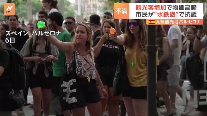 スペインのバルセロナでは観光客の増加が問題となっており、市民らが夏によく見るこんなおもちゃで抗議しました。飲食店で食事をする観光客に「出ていって」と言わんばかりに水鉄砲で水をかけるデモ参加者たち。ス…