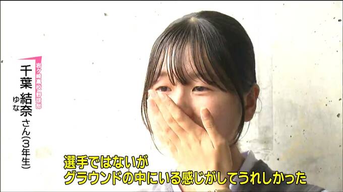 試合前、ノッカーを務めるのは、岩ケ崎高校野球部からただ一人参加するマネージャーの千葉結奈さん(3年)です。選手たちにエールを送ります。