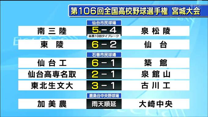 1回戦、その他の結果です。仙台市民球場では、南三陸高校が、タイブレークで勝利しました。石巻市民球場では、仙台工業、仙台高専名取などが2回戦へ駒を進めています。
