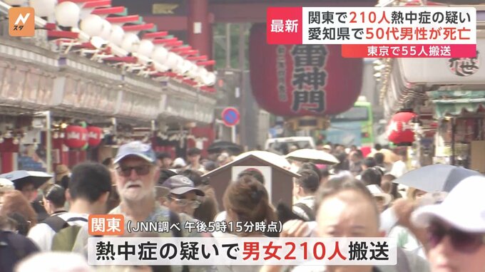 この暑さできょうこれまでに関東では、あわせて210人が熱中症の疑いで病院に運ばれました。愛知県では50代の男性が死亡しています。JNNが各地の消防などの情報を集計したところ、午後5時15分時点で関東で熱中症の…
