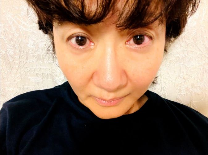 続けて、「どうも湿度はリンパ浮腫と眼の炎症と相性イマイチ」と明かし、「陽が沈むと浮腫みと目の赤みが出てくる」と、自身の顔のアップの写真を添えて「参ります」と、心境を書き込みました。