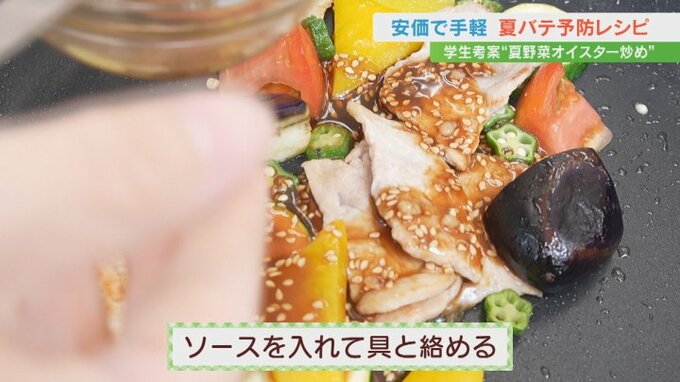 最後にソースを入れてよく絡めます。オイスターソースとゴマ、それにニンニクの香りが広がります。これで完成です。
