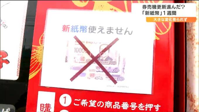 新しい紙幣の発行が始まってから10日で1週間です。1週間が経ち、券売機などの更新は進んでいるのでしょうか。自動販売機と飲食店を取材しました。およそ20台の自動販売機が並んでいる宮城県名取市内のこちらの場所…