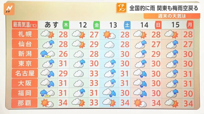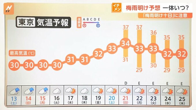 梅雨が戻ってくるとありましたが、実はもう、梅雨明けも見えてきているということです。東京では15日まで雨が続きますが、その先の予報を見ると、25日(木)まで雨マークはありません。