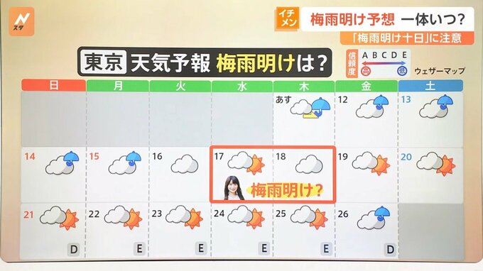 おそらく16日(火)~17日(水)あたりが変わり目で、17日か18日(木)ごろ、平年並みか少し早めに梅雨明けする可能性があるとみています。