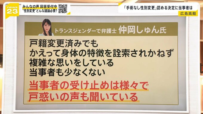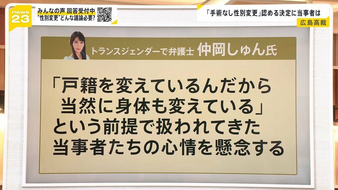 しかし、トランスジェンダーで弁護士の仲岡しゅんさんは「『戸籍を変えているんだから、当然に身体も変えている』という前提で扱われてきた当事者たちの心情を懸念する」としています。