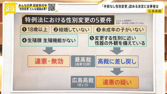 一方、変更後の性別に近い性器の外観を備えているという要件については、高裁に差し戻していましたが、10日に広島高裁が、いわゆる外観要件について「違憲の疑いがあると言わざるを得ない」と指摘しました。手術なしでも外観要件は満たされるという考えを示したわけです。