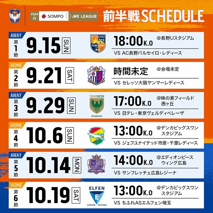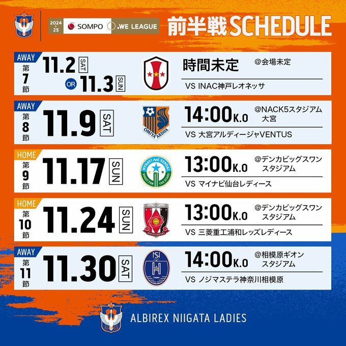 11日に前半戦の日程が発表され、アルビレックス新潟レディースは9月15日(日)にアウェーでAC長野パルセイロ・レディースと開幕戦を戦うことになりました。