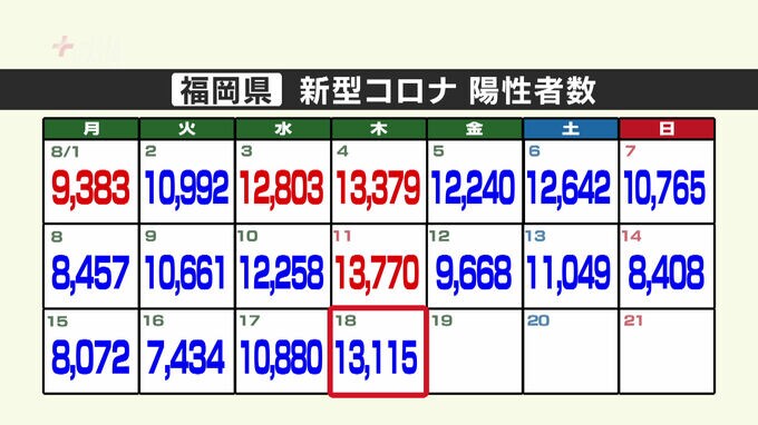 新型コロナウイルスの感染状況です。福岡県は18日、新たに1万3115人の陽性を発表しました。17日時点の病床使用率は77.4%となっています。福岡県の一日ごとの陽性者数を示すカレンダーです。18…