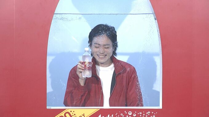 イベントでは、まるでウィルキンソンのボトルの中に入っているような体験ができる、最新冷却装置(ウィルキンソンカプセル)を菅田さんが先行体験。初めての体験に菅田さんは”僕どうなっています??ペットボトルの中に入ったことがないので新鮮”と楽しんでいる様子。しかし、冷却ガスが勢いよく噴射されると、”凄かったです。強刺激でしたね。何も見えなかったです。(ビート)たけしさんの番組とか思い出しました。”と目を丸くして驚きながらも”リフレッシュしますね。びっくりするヒヤッと感もありますけど、自分が小さい生き物になったようなワクワク感もありました”と感想を伝え”体験していただいて、120周年を一緒に盛り上げていけたら”と呼びかけました。