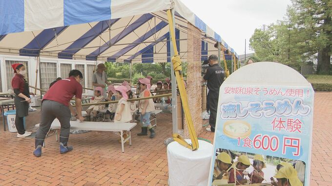 11日は地元の保育園児ら約20人が招待され、イベント期間だけ味わえる地元の安城産でコシが強く、もちもちした食感が自慢の和泉そうめんを使った「流しそうめん」を楽しんでいました。
