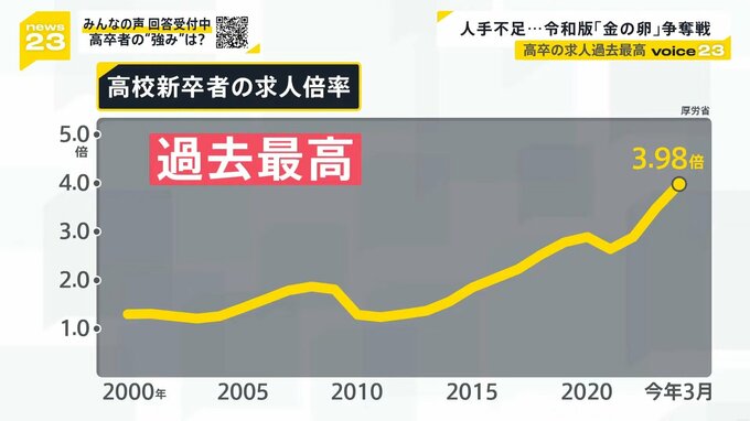 深刻な人手不足の中、今、高校生たちには熱い視線が注がれています。高卒者の求人倍率は今年、全国平均で過去最高の3.98倍を記録。高校生有利の超売り手市場になっているのです。