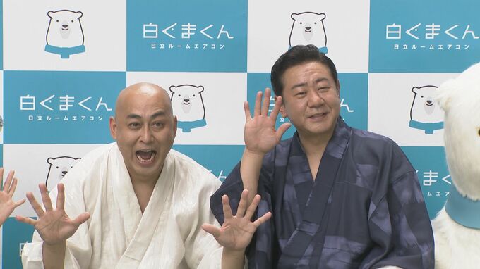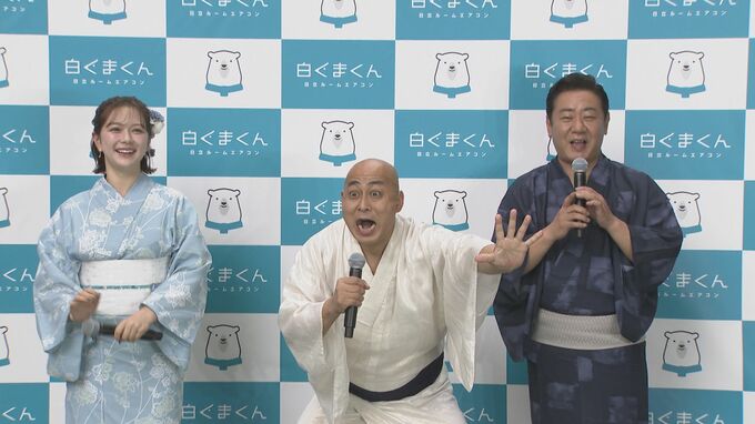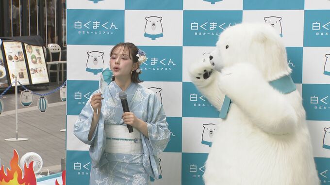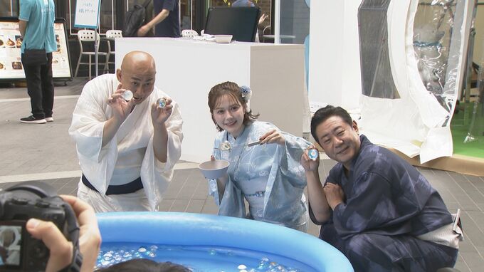 タレントの村重杏奈さんと、お笑いコンビ・錦鯉の長谷川雅紀さんと渡辺隆さんが、「白くまくん COOL PARK 納涼祭」オープニングイベントに出席。