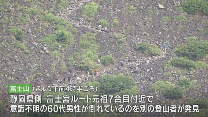 警察によりますと、11日午前4時半ごろ、富士山の静岡県側、富士宮ルート元祖7合目付近の登山道で、意識不明の男性が倒れているのを別の登山者が見つけ、山小屋の従業員に通報しました。