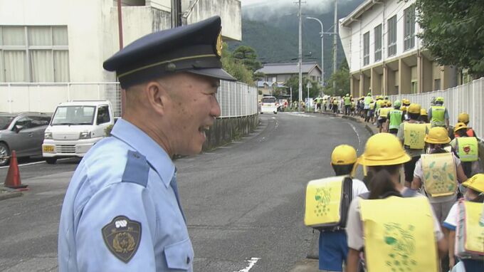 警察官だけでなく郵便局やバス会社の職員なども参加し、子どもたちの見守りに出発しました。