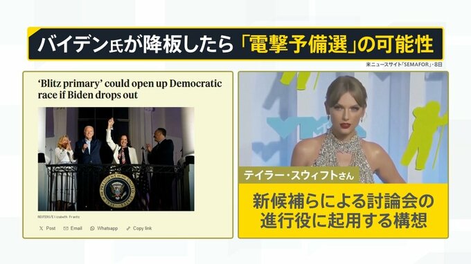 さらに有権者の関心を引くため、新たな候補による討論会の進行役にテイラー・スウィフトさんらを起用する構想だといいます。前回の大統領選でバイデン氏を支持すると表明したテイラーさんの影響力も使いたいということです。