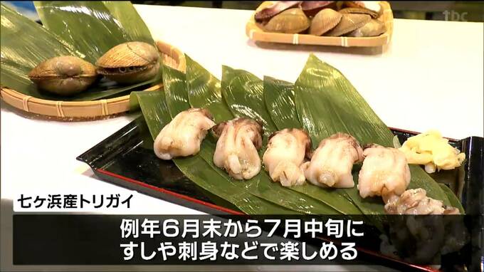 七ヶ浜町は、東北で唯一トリガイの試験養殖に取り組んでいて、出荷は今年で3年目になります。この新鮮なトリガイは寿司や刺身などでおいしくいただけます。