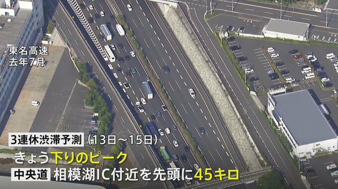 きょうから、お盆前最後の3連休ですが、首都圏の高速道路では45キロの激しい渋滞も予想されています。3連休の高速道路各社の渋滞予測では、きょうが下りのピークで、▼中央道・相模湖インターチェンジ付近を先頭に4…