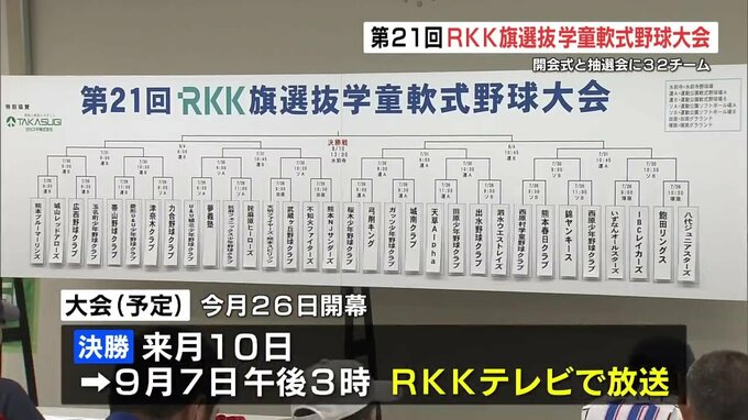 小学生球児が熱戦を繰り広げる「RKK旗選抜学童軟式野球大会」の開会式と組み合わせ抽選会が7月13日に行われました。熊本ブルーマーリンズ 前田涼佑 主将「最後の1球まで正々堂々と全力で戦い抜くことを誓います」…