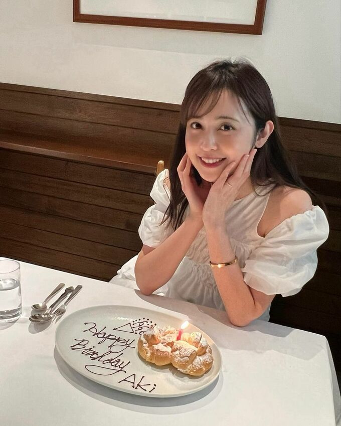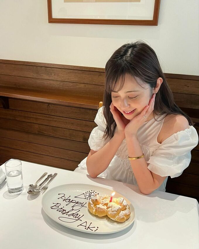 投稿された写真では、鮮やかな花が彩られた黒のキャミソールワンピースでパスタを楽しむ様子や、シュークリームにろうそくがともされ「Happy Birthday Aki」とバースデーメッセージが記されたプレートを見つめ、笑顔を見せる久慈さん。