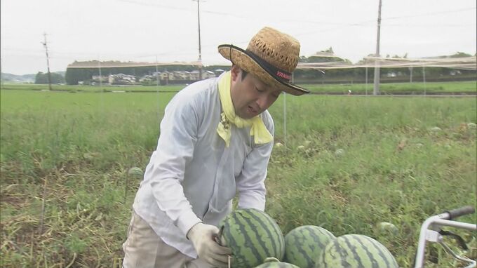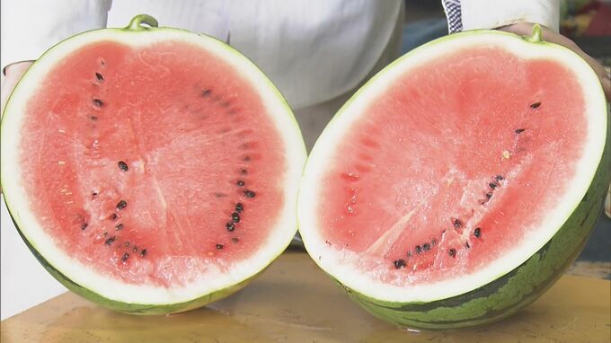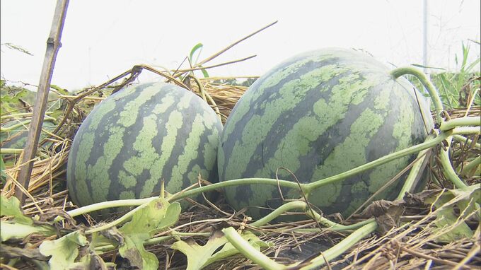 ことしは、今月はじめに続いた雨の影響で生育にむらがあるものの、例年と変わらない甘いスイカができたということです。収穫されたスイカは地元の道の駅などで販売されます。