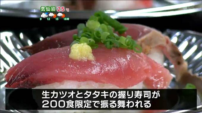 13日から始まったかつお祭りは、気仙沼市魚市場に水揚げされた旬のカツオをPRする催しです。14日は、生カツオとタタキの2種類の握り寿司が200食限定で無料で振る舞われました。